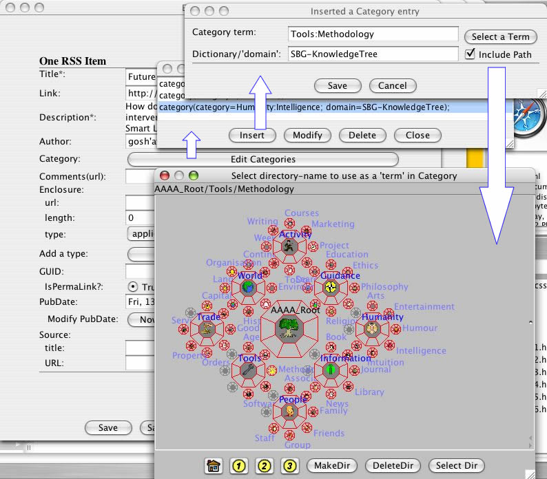 An option has been added to the RSS Editor within the DigitalFriend that uses the FUN interface of the Knowledge Tree, to simply 'tag' an entry with keywords. RSS files have a <category> option which is generally under-utilitised by the RSS-file editing public. We figured that it should be made far easier to tag RSS items, in order to help the authors of news items to tag their items. So, we use the KnowedgeTree itself - which is where the DigitalFriend user stores their various files and other resources - as a user-friendly selection mechanism.