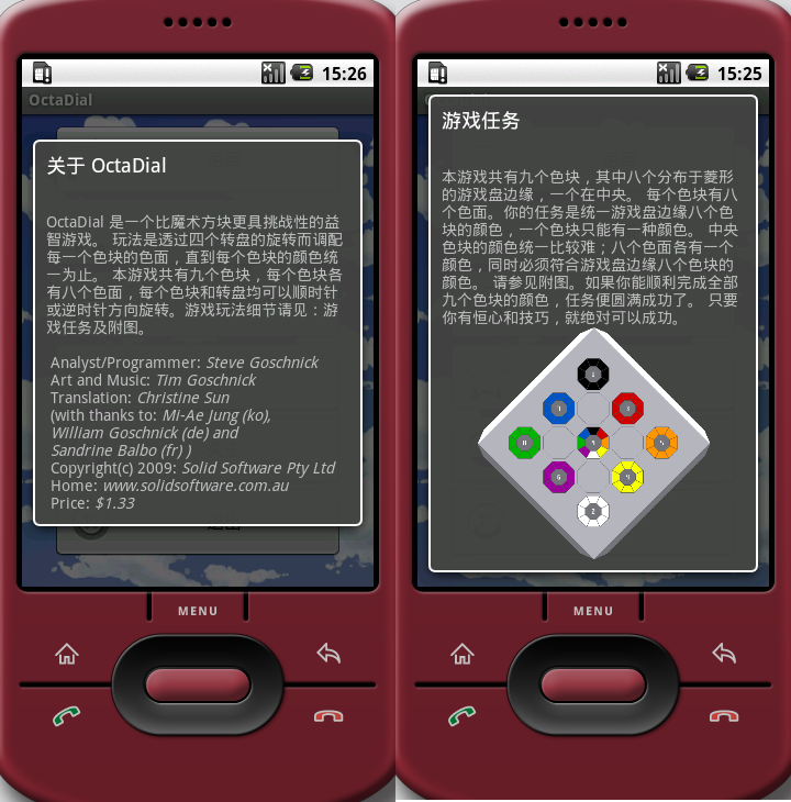 I brought in son Tim as Artist, who is currently doing a Degree in Computer Games (lucky lad) and knows his way around graphics and music. Coincidently, he was born in 1990, in line with the original OctaDial on DOS! Dr Christine Sun, my better half, came onboard as Translator, giving us Traditional and Simplified Chinese locales almost right away. The following image is the main menu and the game in portrait mode, in the phone emulator within the SDK (software development kit).
