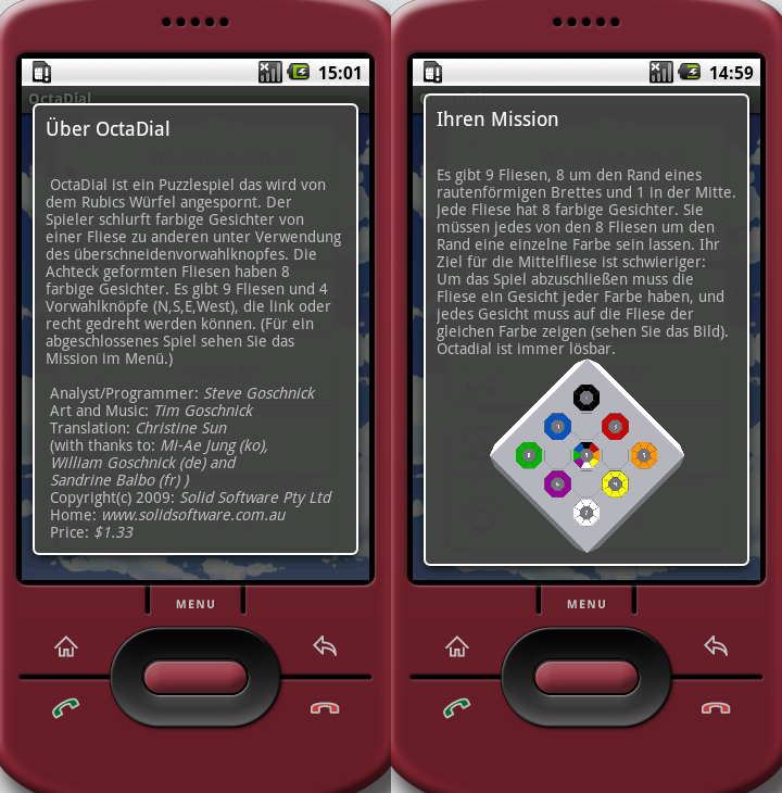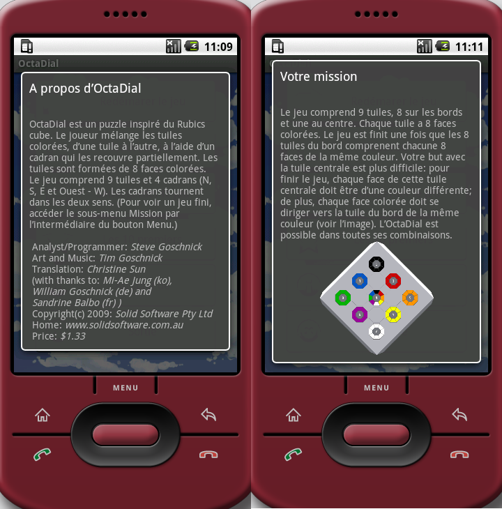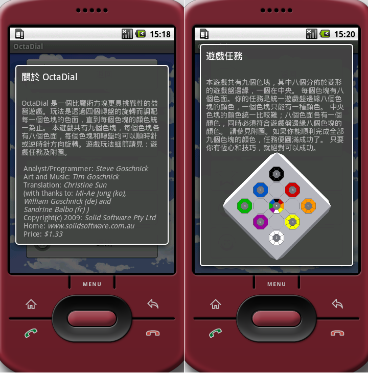 We figured it was important to pick up as many locales as possible for those countries where they currently are or will soon be selling Android-powered phones. Since there is not a lot of language in the game - as you can see in Image1, during game-play itself there is no language at all - it was conceivable to do a handful of languages, even in the hard-pressed time schedule laid down by ADC II. However, as can be seen in Image2 above, there are the menu button labels, plus a paragraph in 'The About' pop-up window and another paragraphs worth in the player's 'Mission' pop-up (see figures below). With some editing by friends, family and associates, Christine managed to include 7 languages, namely: English, Traditional Chinese, Simplified Chinese, Korean, Japanese, German and French (plus some Italian).